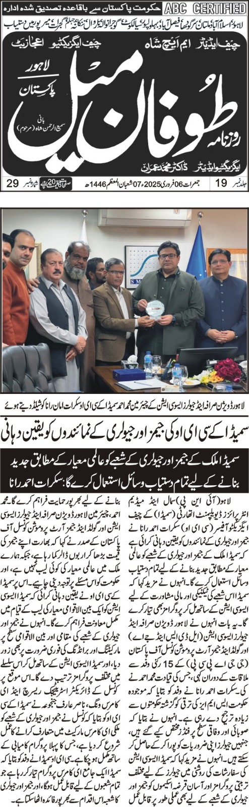 LAHORE: 3 February2025 The Small and Medium Enterprises Development Authority (Smeda) Chief Executive Officer (CEO) Socrat Aman Rana has assured the representatives of Gems and Jewellery sector to utilize all available resources to modernize the country’s gems and jewellery sector according to the global standards.